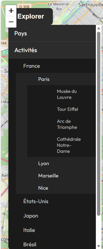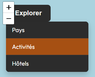 Une fois que vous avez cliqué sur le bouton "Commencer", la carte du monde s’affiche. En haut à gauche, vous trouverez votre outil d’exploration avec trois catégories : "Pays", "Activités" et "Hôtels", pour naviguer facilement et découvrir tout ce que Globaya propose.